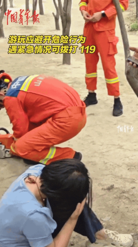 消防员叔叔来了就想办法,合力掰树杈,拖拽女子都不好使,就差锯树了,最后把女子的身体转了转,这才把女子从树杈里抬出来。